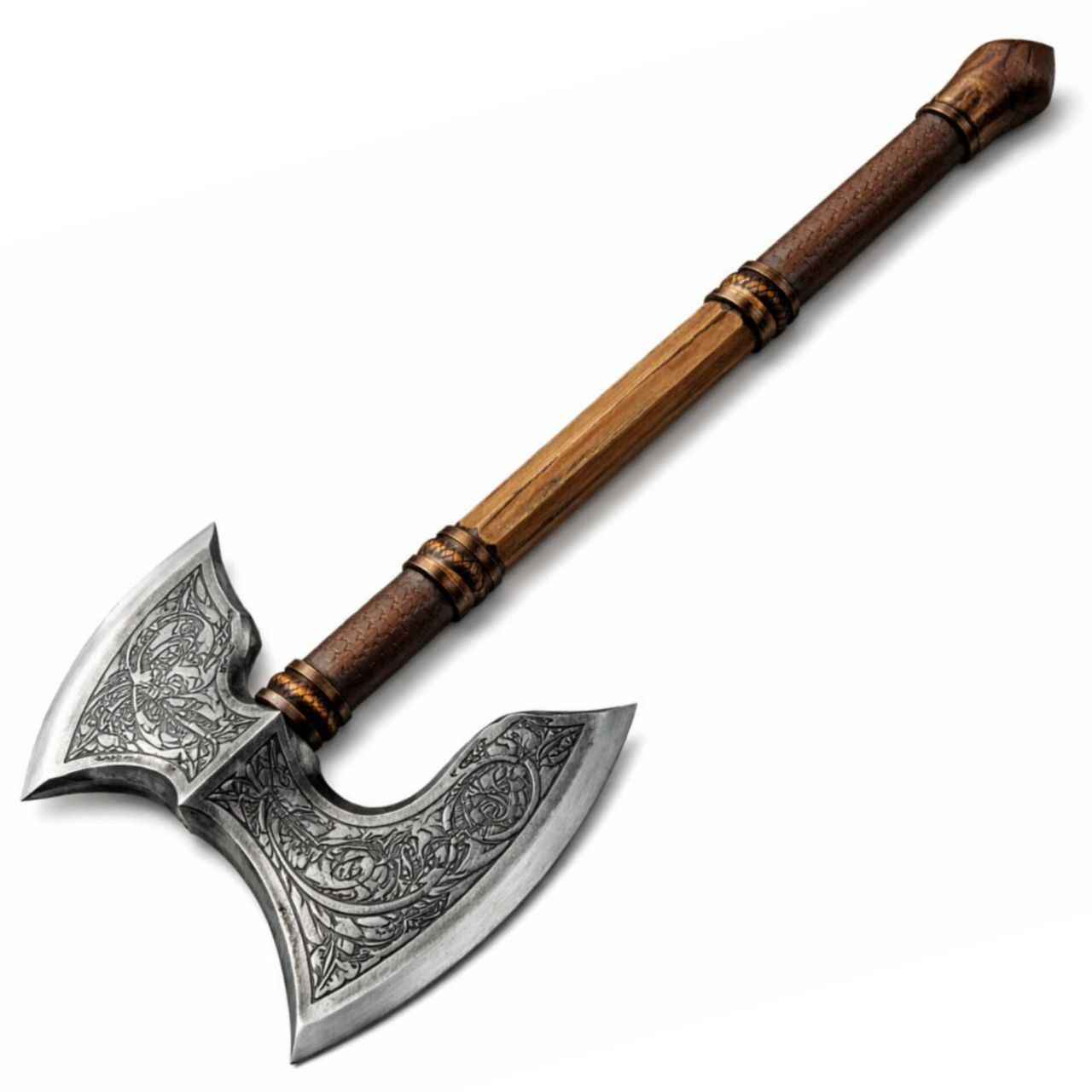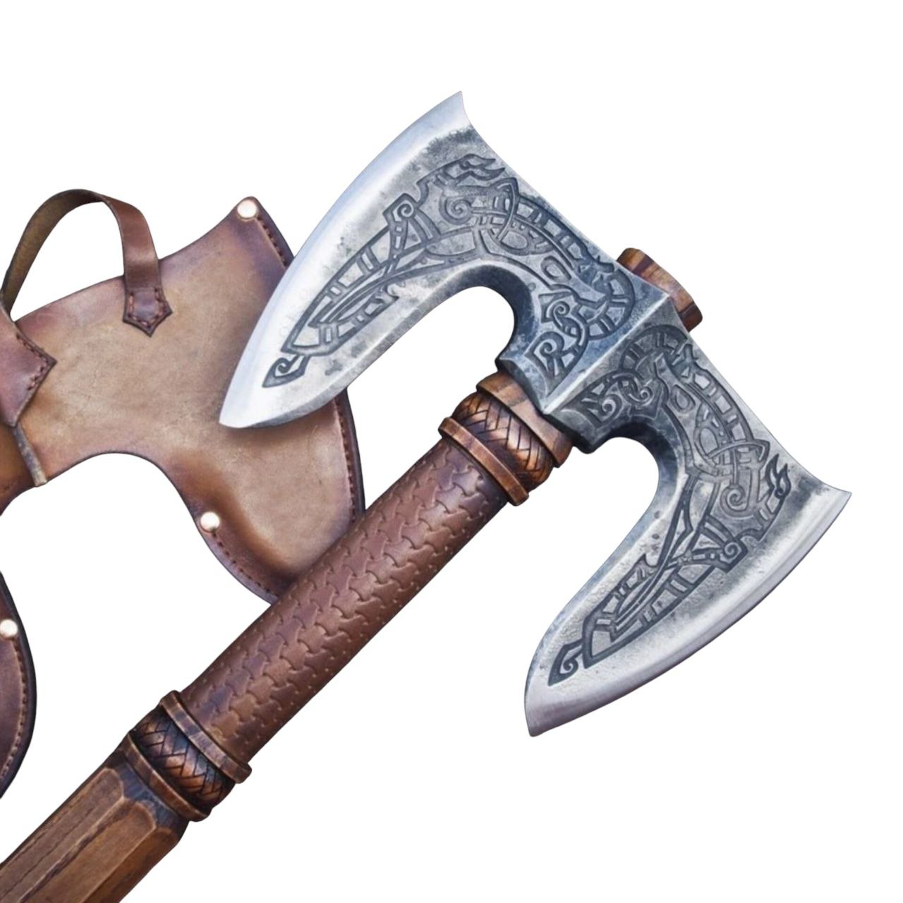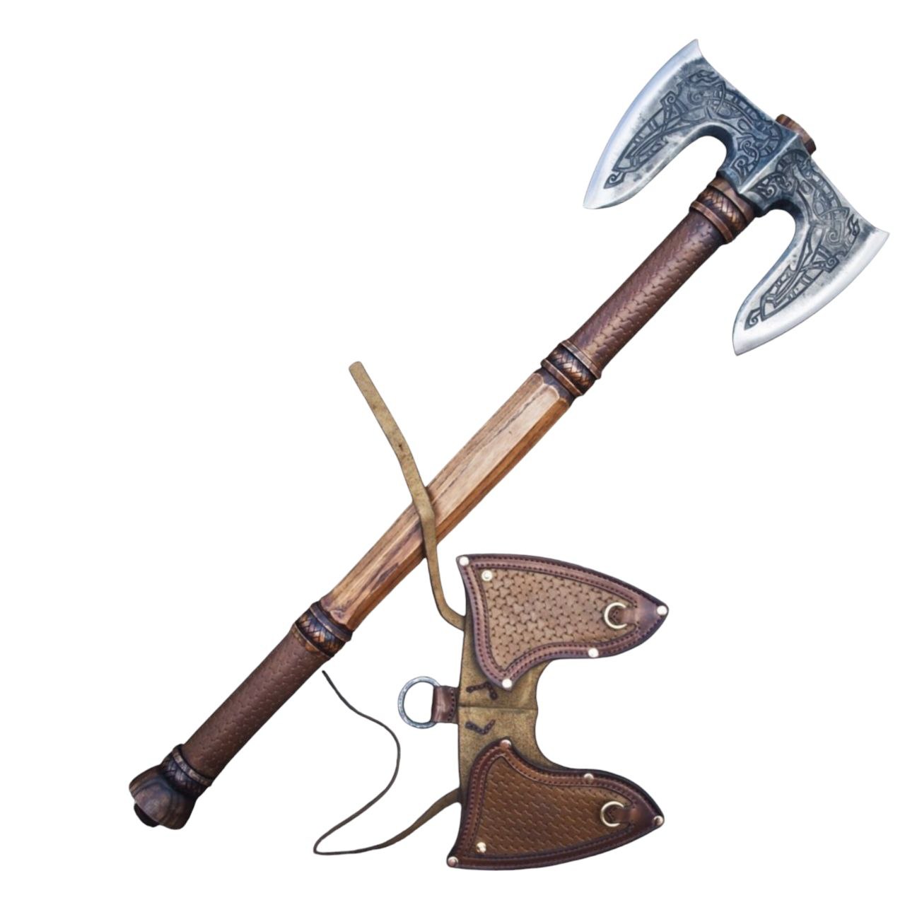 Рукоять изготовлена из ясеня — плотной и упругой древесины, хорошо переносящей нагрузки. Поверхность украшена резьбой, подчёркивающей характер изделия, затем выполнено тонирование и пропитка тунговым маслом для защиты от влаги и внешних воздействий. Зона хвата дополнительно обтянута кожей растительного дубления с тонированием и фактурным тиснением — это усиливает сцепление, добавляет тактильную глубину и визуальную выразительность.