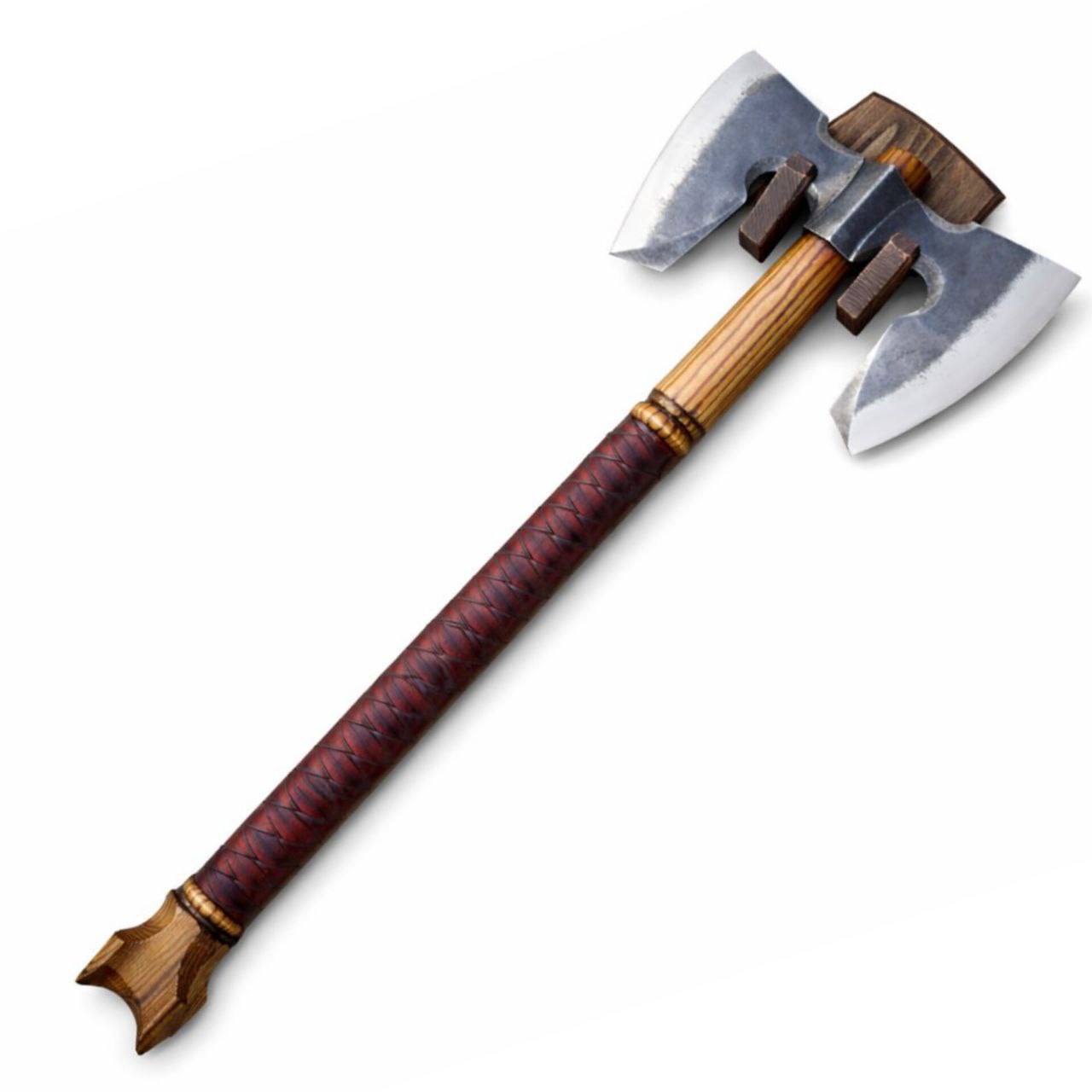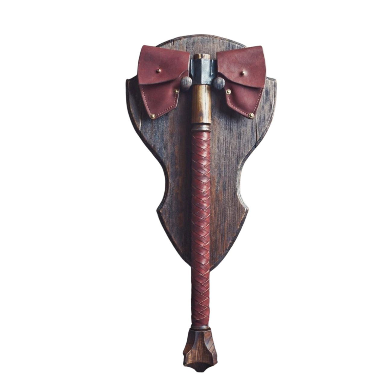 Рукоять выполнена из ясеня со склейкой, что обеспечивает стабильность геометрии и надёжность конструкции. Древесина тонирована мебельным воском, который подчёркивает текстуру и придаёт тёплый, глубокий оттенок. В зоне хвата рукоять оплетена шорно-седельной кожей — это добавляет уверенности в удержании и усиливает тактильные ощущения, а также поддерживает общий брутальный стиль модели.