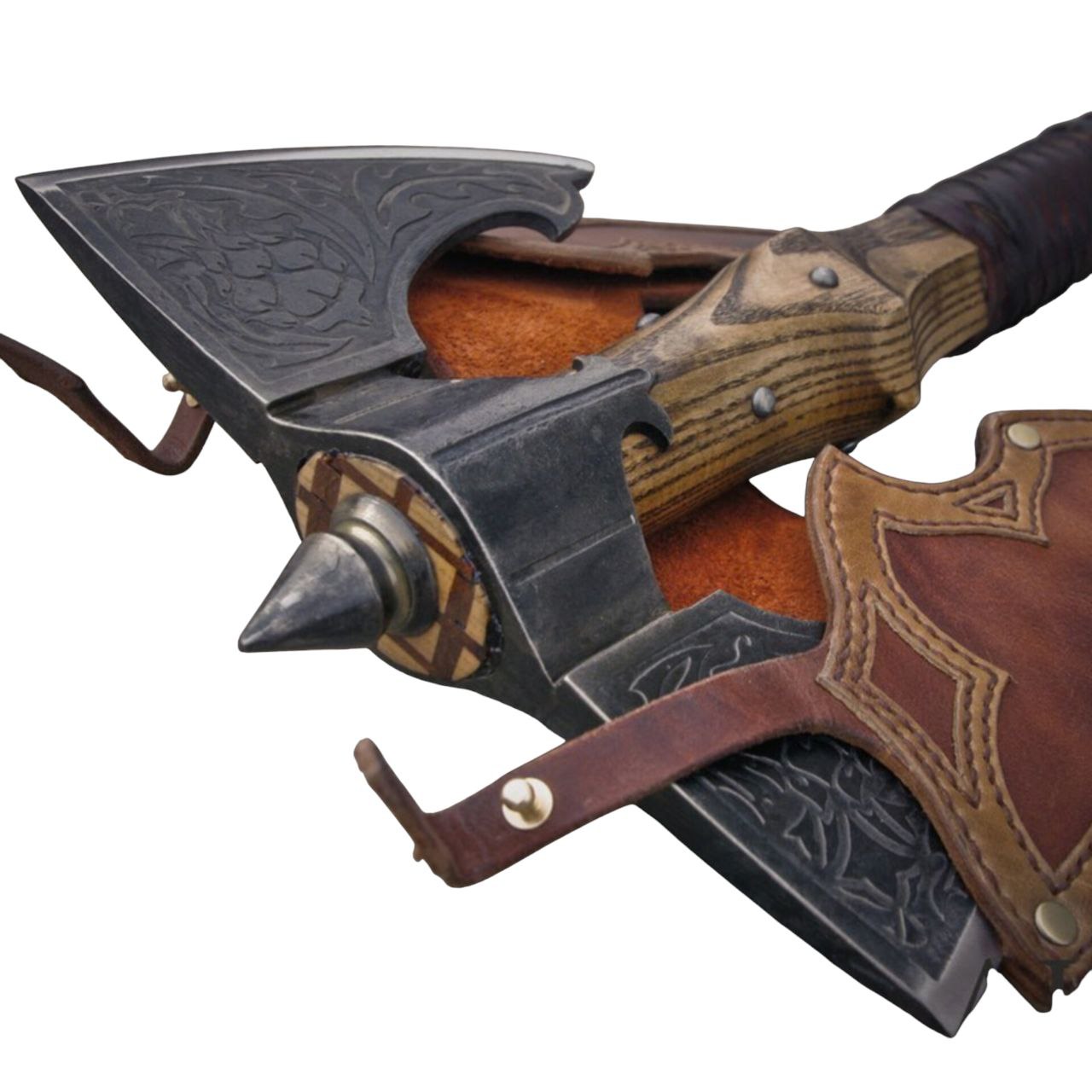 Топор Секира “Чертополох”  (CHT-P) — художественная секира с ярко выраженным декоративным характером, где образ строится вокруг орнамента и пластики форм. Модель выглядит как предмет из легенды или старинного эпоса: в ней сочетаются кованая мощь, растительный мотив и тёплая фактура натуральных материалов. Это не просто оружейная форма, а полноценная ремесленная композиция.