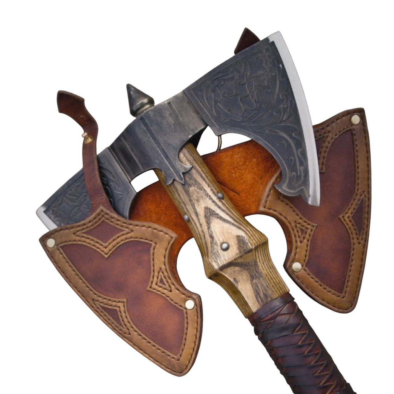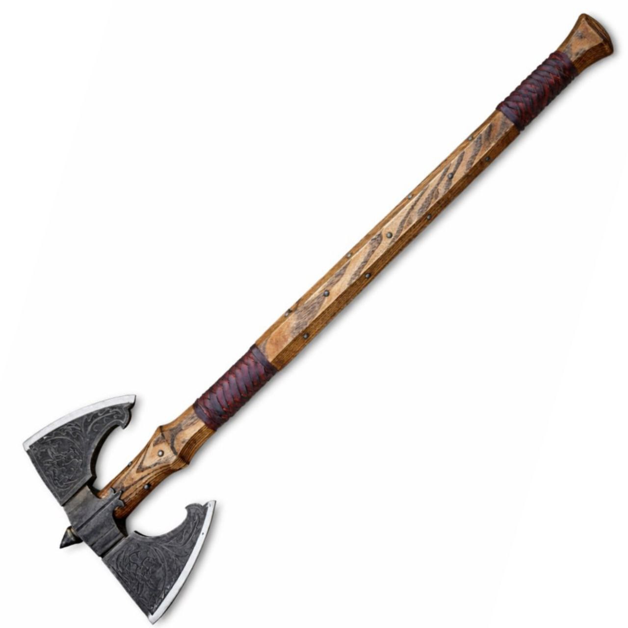Рукоять выполнена из ясеня с резьбой, что добавляет изделию ручного характера и подчёркивает ремесленную составляющую. Древесина тонирована воском для проявления текстуры и пропитана тунговым маслом, обеспечивающим защиту и долговечность. В местах хвата присутствует оплётка кожаной тесьмой — она улучшает сцепление с ладонью и гармонично вписывается в общий декоративный стиль.