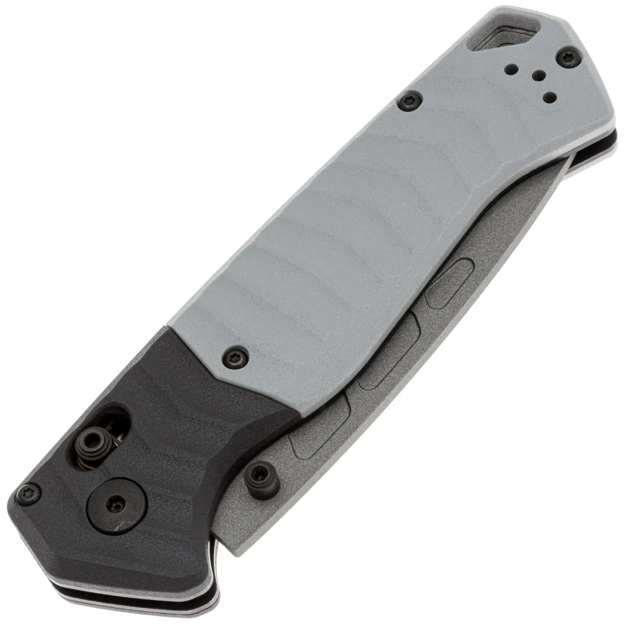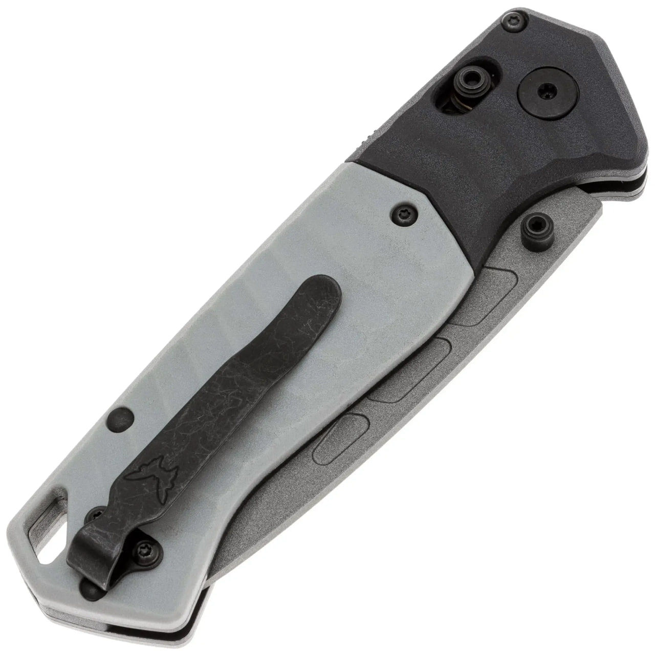 Рукоять выполнена из Grivory — прочного композитного материала, известного своей устойчивостью к ударам, влаге и перепадам температур. Этот материал отличается лёгкостью и высокой прочностью, что делает нож удобным для длительного ношения. Двухцветная комбинация чёрного и серого придаёт модели современный внешний вид. Текстурированная поверхность рукояти обеспечивает уверенный хват даже во влажных условиях или в перчатках. Для удобного ношения нож оснащён переставляемой клипсой глубокой посадки и отверстием для крепления темляка.