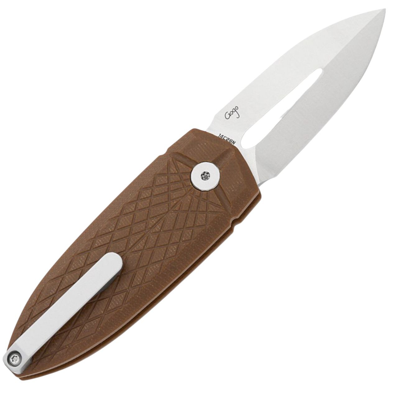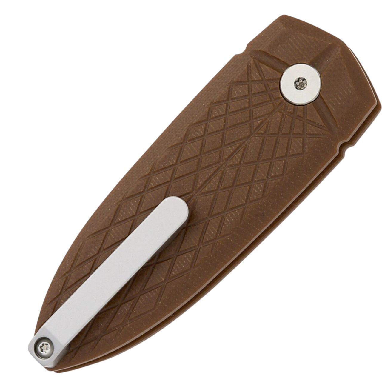 Рукоять изготовлена из коричневого G10 с аккуратной фрезеровкой, обеспечивающей дополнительный хват и приятные тактильные ощущения. G10 отличается устойчивостью к влаге, перепадам температуры и износу, а тонкий профиль делает нож особенно удобным для постоянного ношения. Эргономика рассчитана так, чтобы нож моментально фиксировался в руке, не выскальзывал и позволял выполнять точные задачи, несмотря на компактный размер.