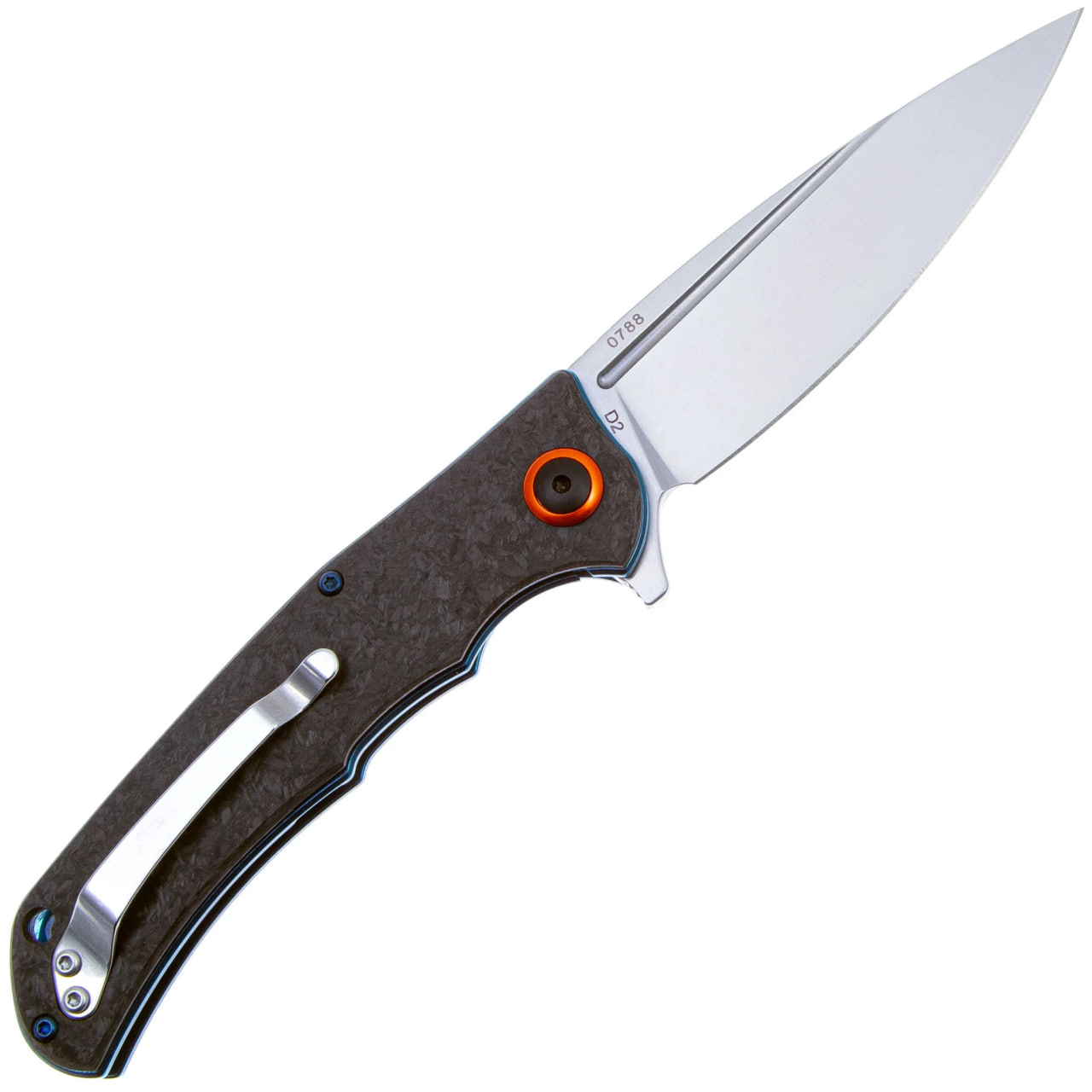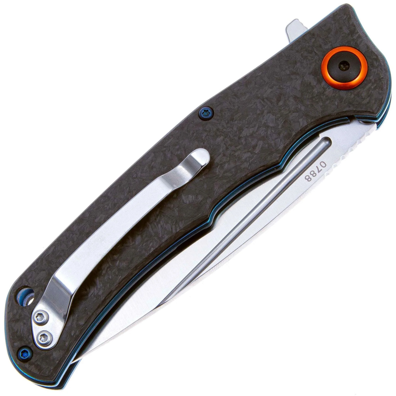 Рукоять выполнена из карбона с красивой текстурой, формируемой переплетением углеродных волокон. Такой материал сочетает минимальный вес, высокую прочность и устойчивость к химическим воздействиям, при этом создавая выразительный премиальный внешний вид. Мраморный карбон особенно хорошо играет на свету, меняя глубину оттенков под разными углами. Спейсер благородного лазурного цвета и чёрный осевой узел с оранжевой окантовкой дополняют дизайн, делая модель визуально цельной и выделяющейся без лишней экстравагантности.