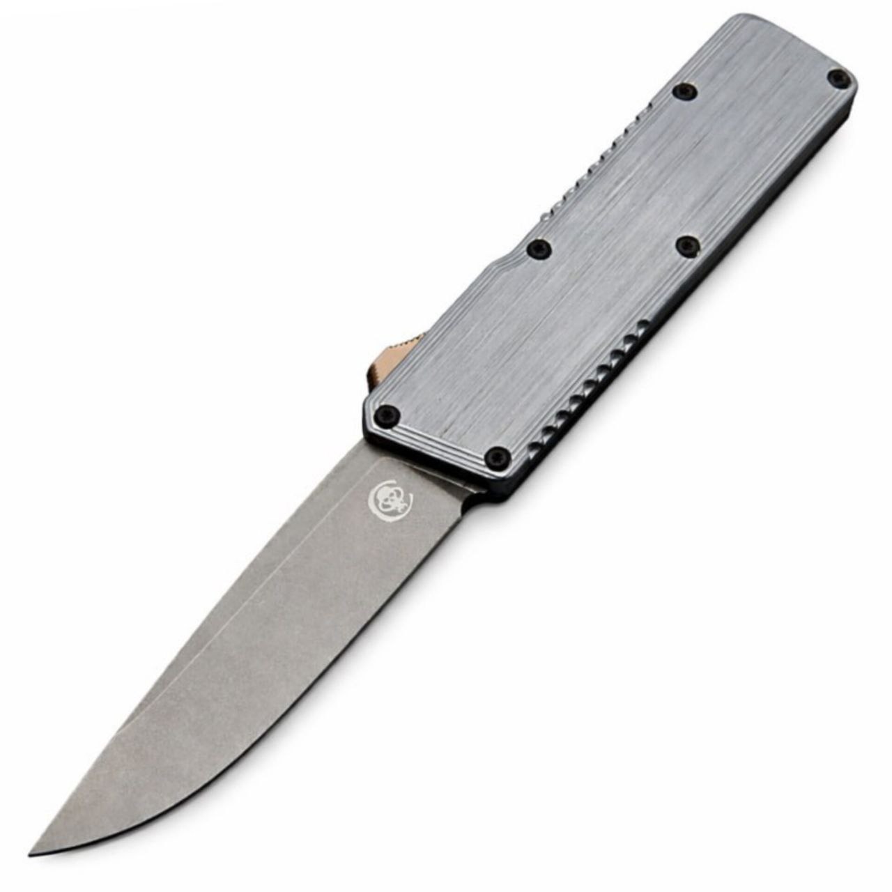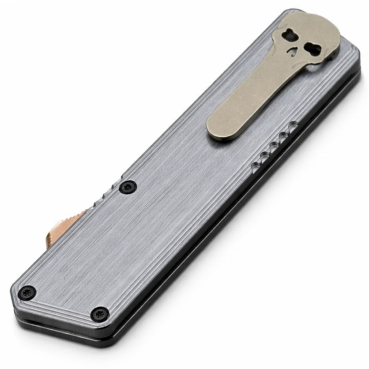 Рукоять ножа выполнена из алюминия синего цвета. Этот материал отличается высокой прочностью при небольшом весе, благодаря чему нож остаётся лёгким и удобным для ежедневного ношения. Эргономичная форма рукояти обеспечивает уверенный и контролируемый хват при работе. На рукояти расположен ползунок механизма, который отвечает за выдвижение и возврат клинка. Нож оснащён карманной клипсой, позволяющей удобно носить его в кармане, а также отверстием под темляк.