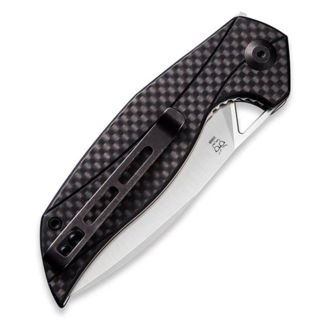 Рукоять выполнена из чёрного G10 с карбоновыми накладками, что обеспечивает лёгкость, прочность и привлекательный внешний вид. Тонкий профиль и эргономичная форма гарантируют удобное удержание, а глубокая клипса позволяет носить нож максимально незаметно. В конструкции предусмотрен стальной лайнер и бэкспейсер из G10, которые добавляют надёжности и долговечности.