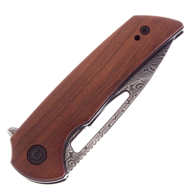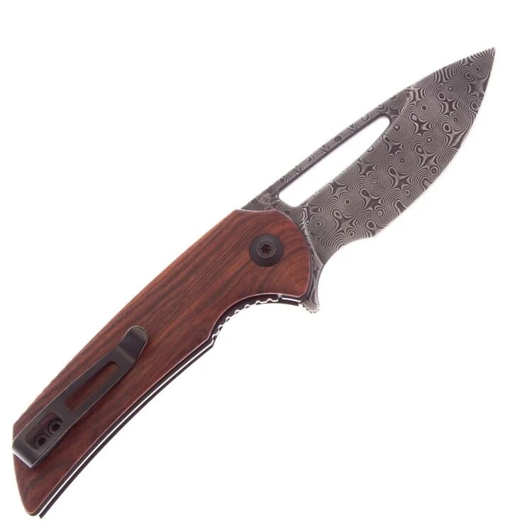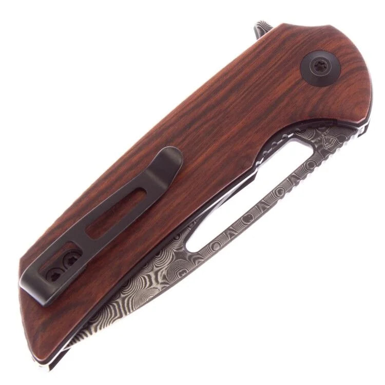Рукоять выполнена из натурального дерева Sandalwood (Cuibourtia), которое обладает прочностью, приятной текстурой и сохраняет тепло при удержании. Её простая и эргономичная форма позволяет использовать нож в различных хватах, обеспечивая комфорт при любых задачах. Дополнительно предусмотрены клипса для удобного ношения и отверстие для темляка.