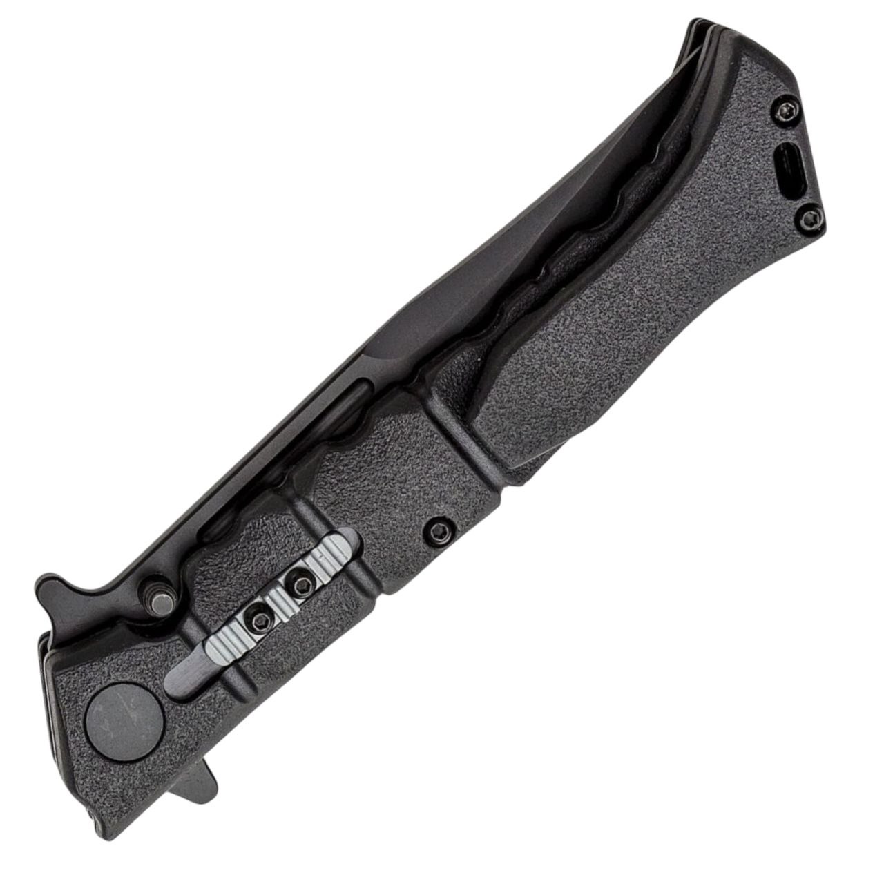 Клинок выполнен из нержавеющей стали 8Cr13MoV с закалкой до твёрдости около 57–58 HRC. Чёрное покрытие защищает металл от коррозии и снижает блики, сохраняя привлекательный внешний вид. Форма clip point с плоским спуском делает клинок универсальным и эффективным в резе и колющем движении. За фиксацию отвечает система Leaf-Spring Lock с дополнительным предохранителем, обеспечивающим надёжную работу даже при интенсивных нагрузках.