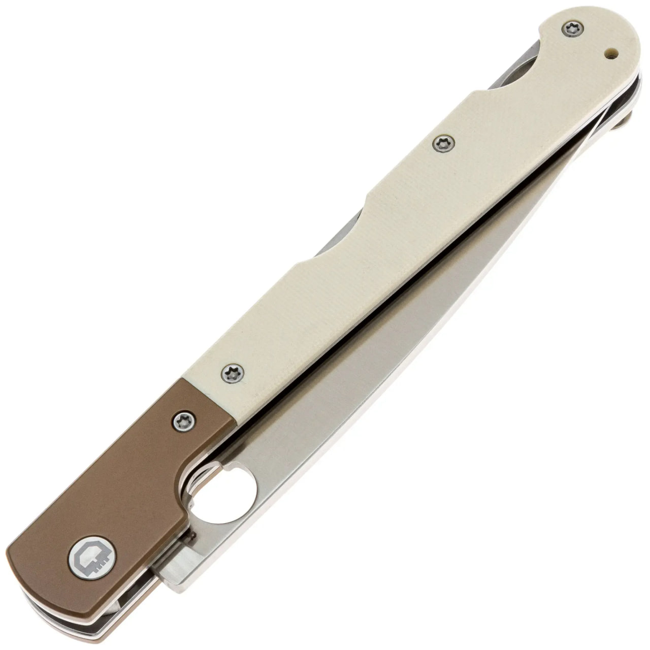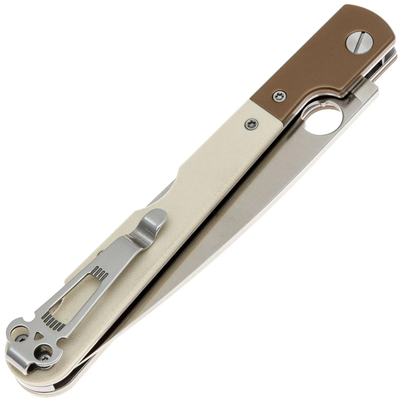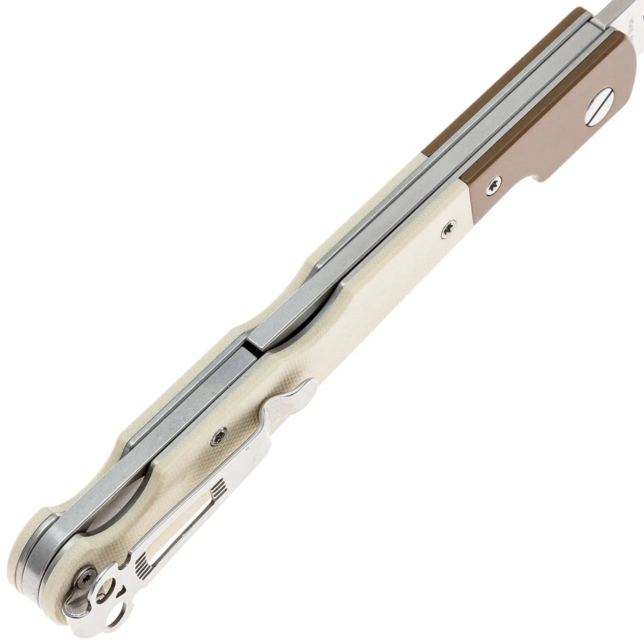 Рукоять изготовлена из стойкого к износу G10 светлого кремово-белого оттенка, который делает нож заметно более выразительным на фоне классических тёмных моделей серии. Материал сохраняет высокую прочность, не боится влаги и температурных перепадов, обеспечивая уверенный хват даже при интенсивной работе. Стальная внутренняя усилительная конструкция придаёт рукояти жёсткость, а продуманная форма позволяет держать нож комфортно, сохраняя контроль в любых положениях руки. Карманная клипса обеспечивает удобное ежедневное ношение, а отверстие под темляк даёт возможность добавить персонализацию.