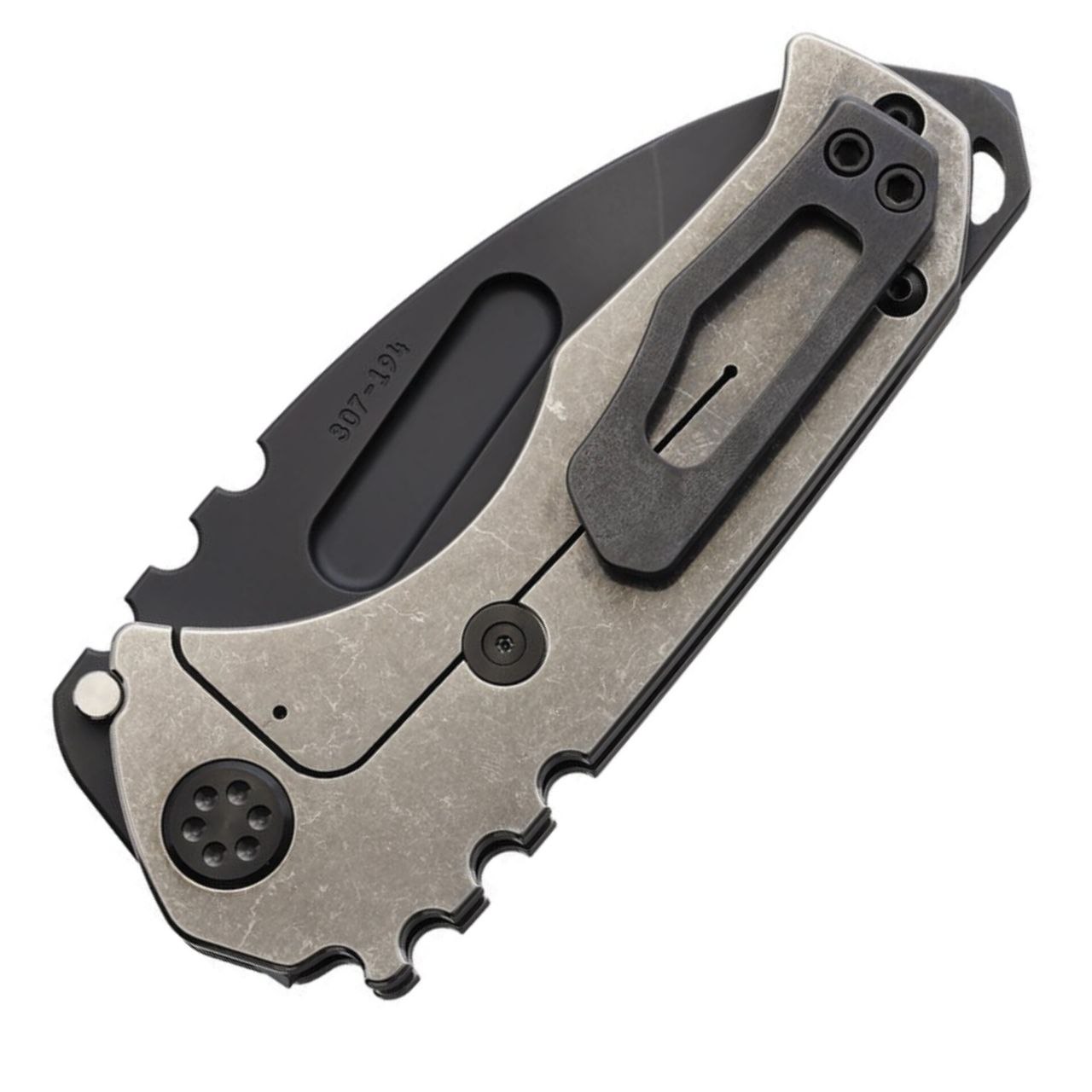 Рукоять изготовлена из титана и имеет обработку tumbled, благодаря которой поверхность приобретает матовую текстуру и становится более устойчивой к следам эксплуатации. Конструкция рукояти обеспечивает уверенный и комфортный хват, а характерная форма подчеркивает фирменный стиль Medford. Нож оснащён карманной клипсой, отверстием под темляк, а также стеклобоем, что делает модель практичной и функциональной в повседневном использовании.