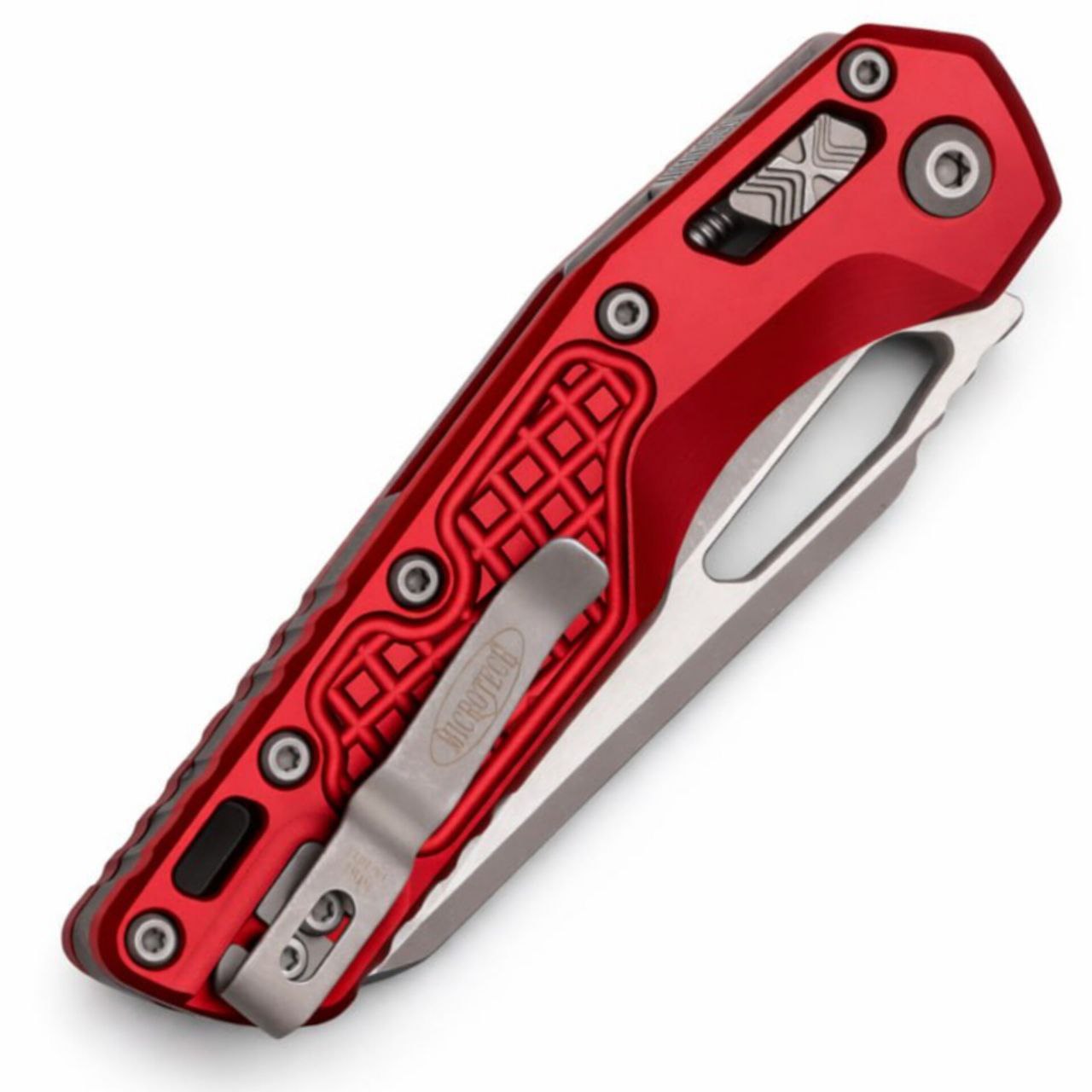 Рукоять выполнена из алюминия в цвете Merlot с агрессивной фрезеровкой Frag. Такая текстура значительно повышает сцепление с рукой и подчёркивает тактический характер модели. Конструкция усилена титановым бэкспейсером, что добавляет жёсткости и долговечности. Установлена реверсивная клипса для ношения с левой или правой стороны. Визуально модель выделяется фирменной кнопкой X с обеих сторон, интегрированной в механизм RAM-LOK.