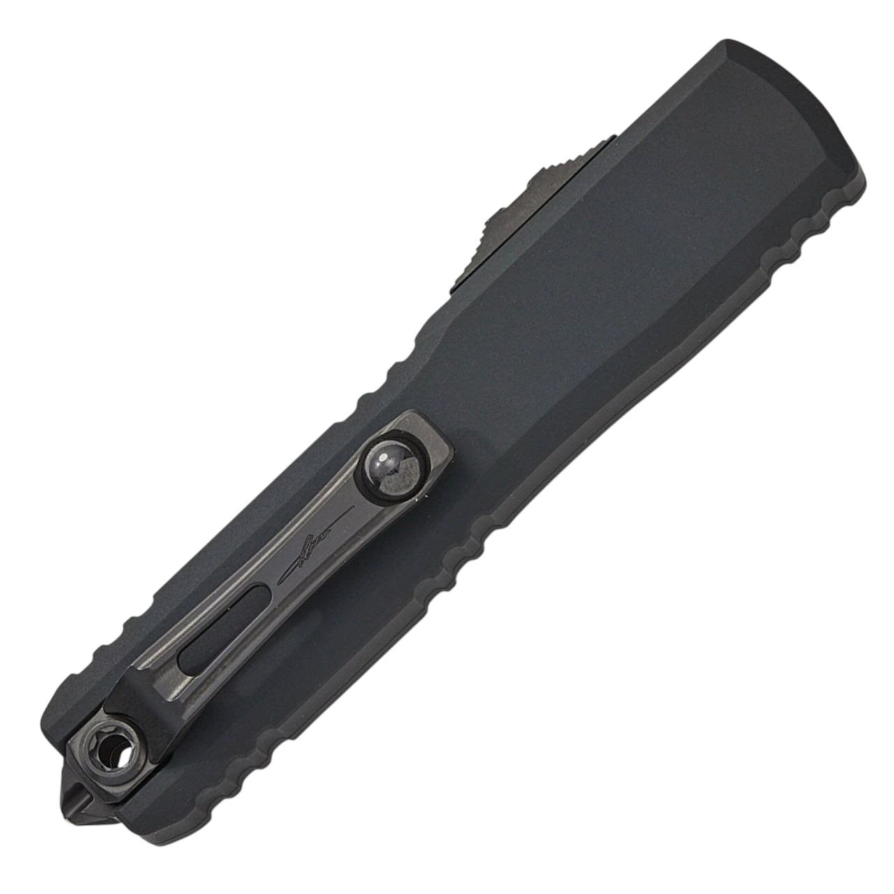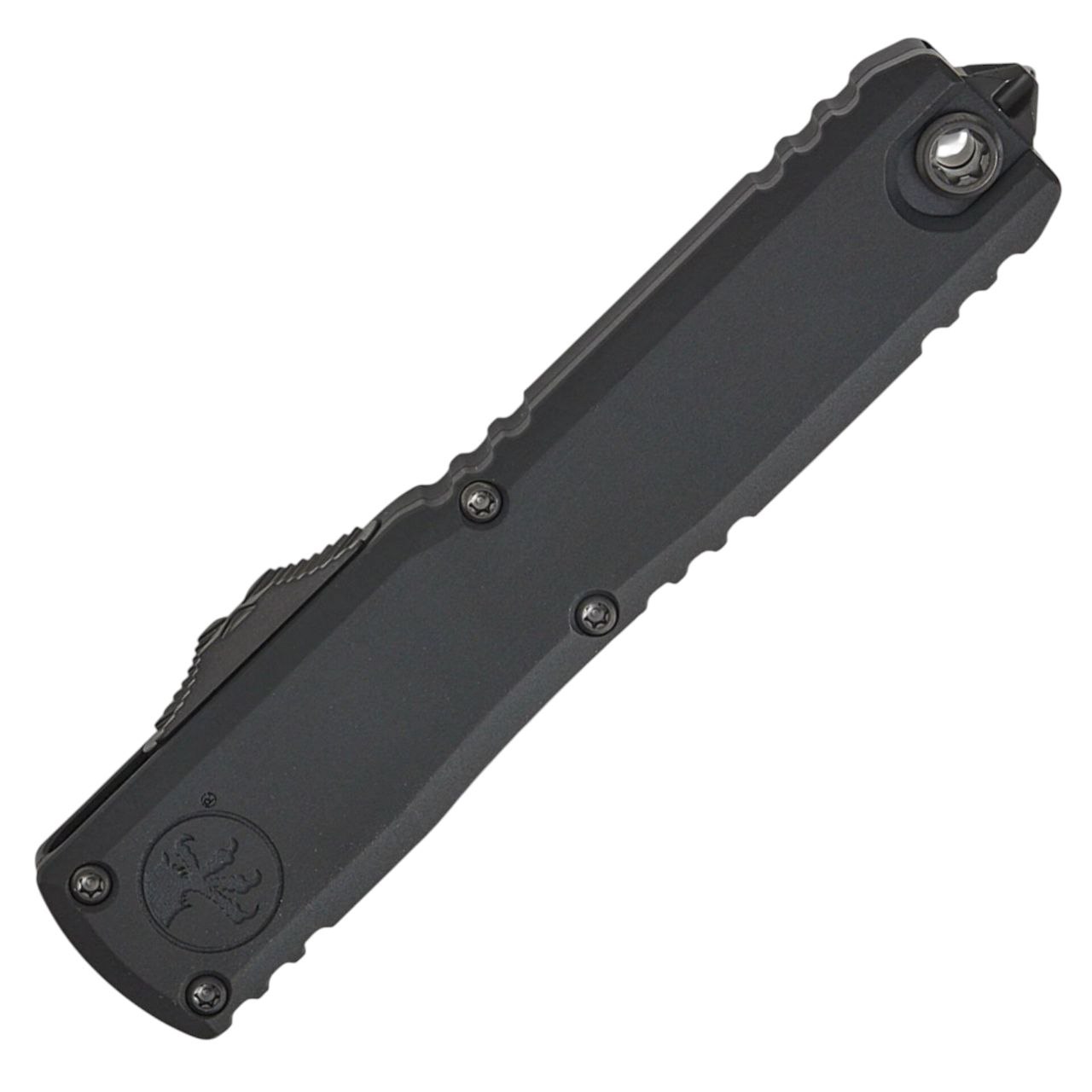 Рукоять изготовлена из прочного алюминия 6061-T6, обработанного анодированием и покрытого стойким DLC-слоем. Благодаря продуманной геометрии и качественной фактуре нож уверенно лежит в руке и обеспечивает надёжный контроль. На корпусе расположены аккуратные насечки, улучшающие удержание, а тыльная часть оснащена стеклобоем. Клипса выполнена в фирменном стиле Microtech и позволяет удобно переносить нож в кармане. Конструкция использует модульный подход третьего поколения Ultratech, упрощающий обслуживание механизма.
