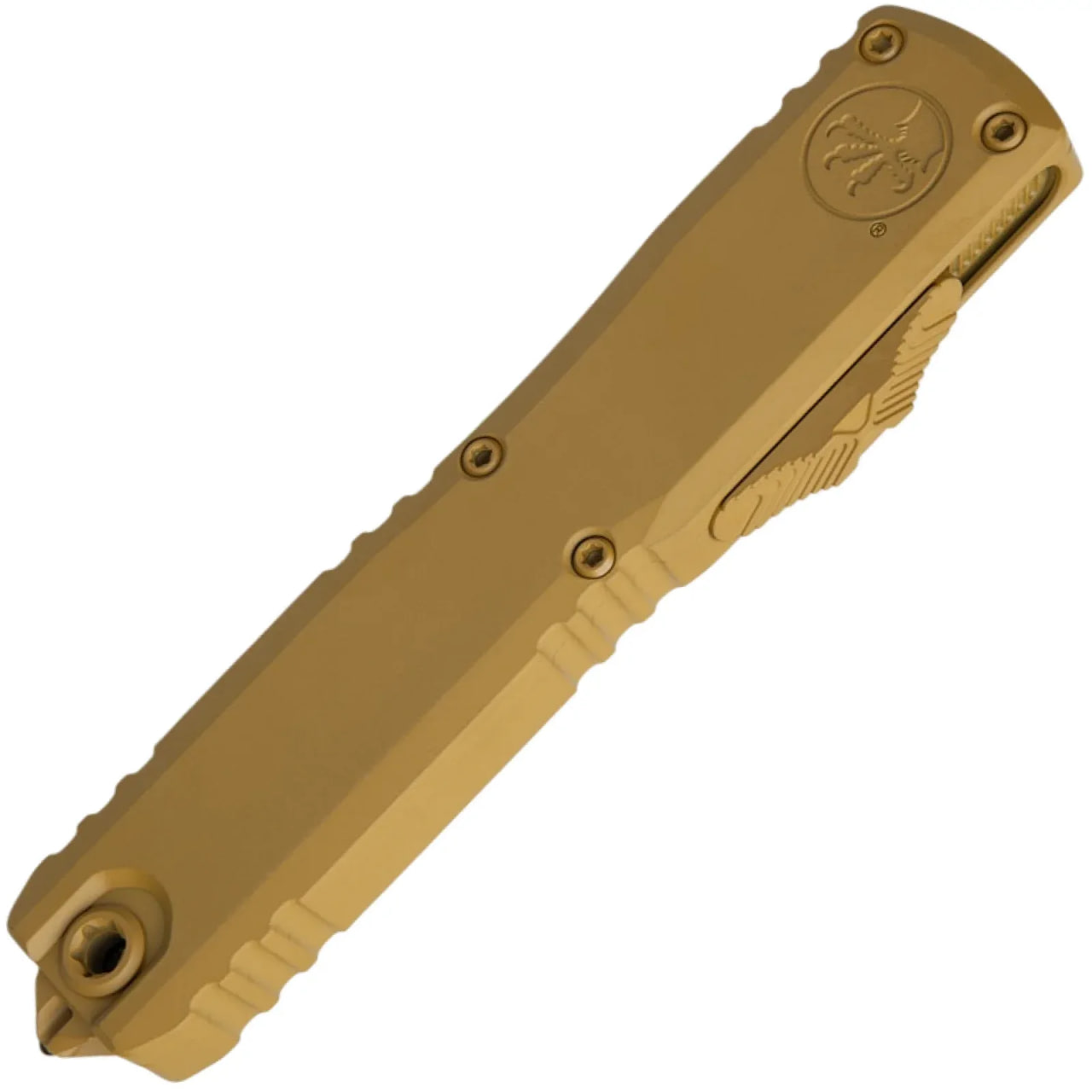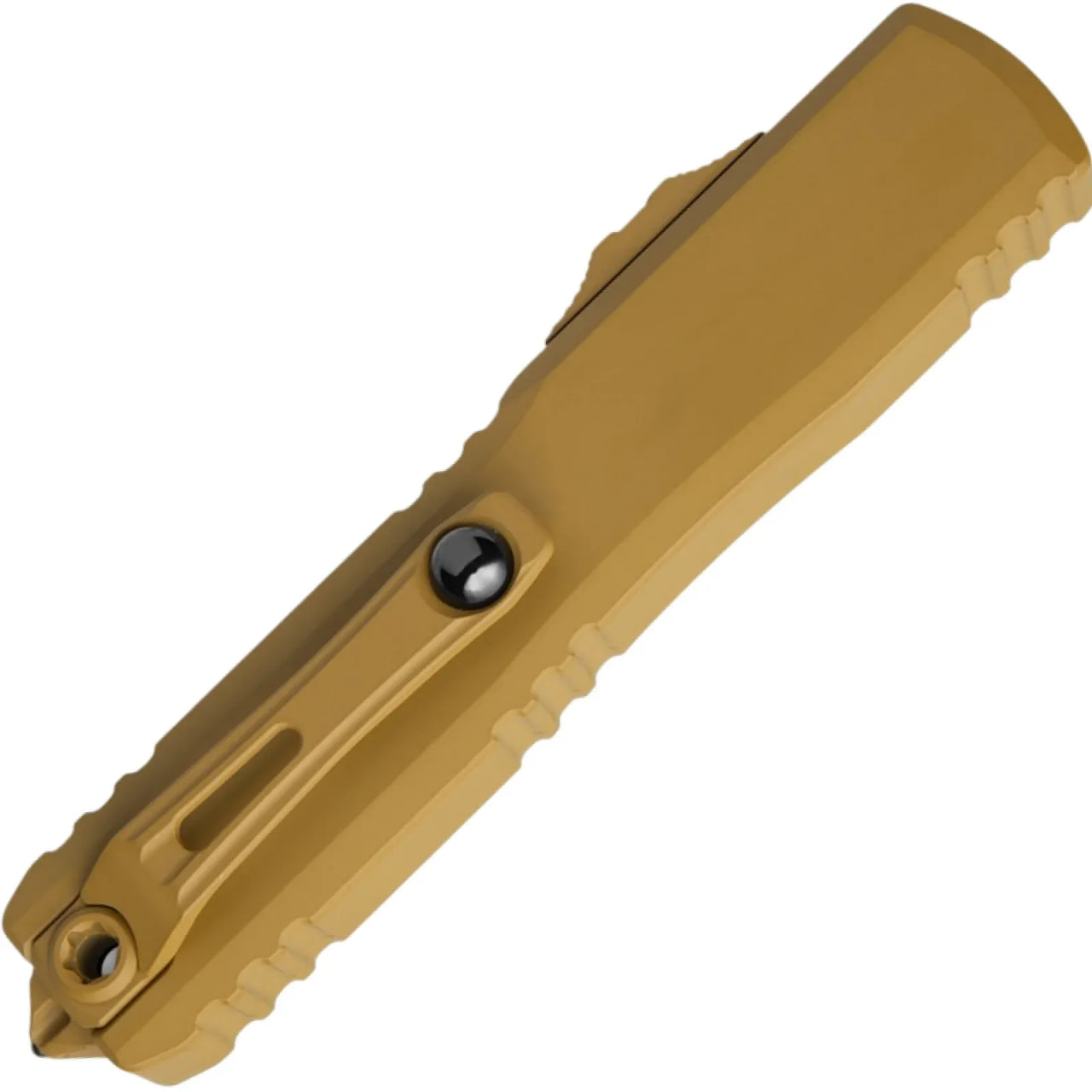 Рукоять изготовлена из алюминия 6061-T6 в покрытии Cerakote RAL-8000. Материал лёгкий, прочный и устойчивый к внешним воздействиям. Рифлёная геометрия корпуса обеспечивает надёжный хват и контроль. Установлена титановая клипса с керамическим шариком, уменьшающим износ ткани при ношении. В конструкции используются стандартные Torx-винты, упрощающие обслуживание. Обновлённый стеклобой аккуратно интегрирован в торец рукояти и не цепляется за одежду.