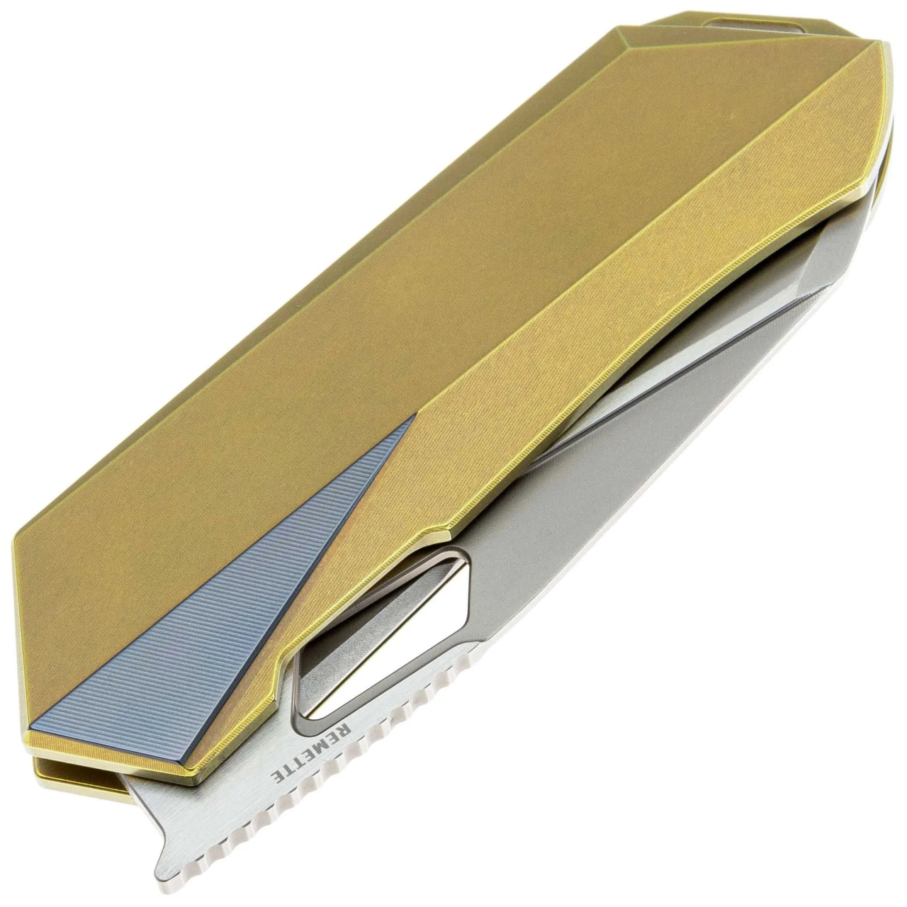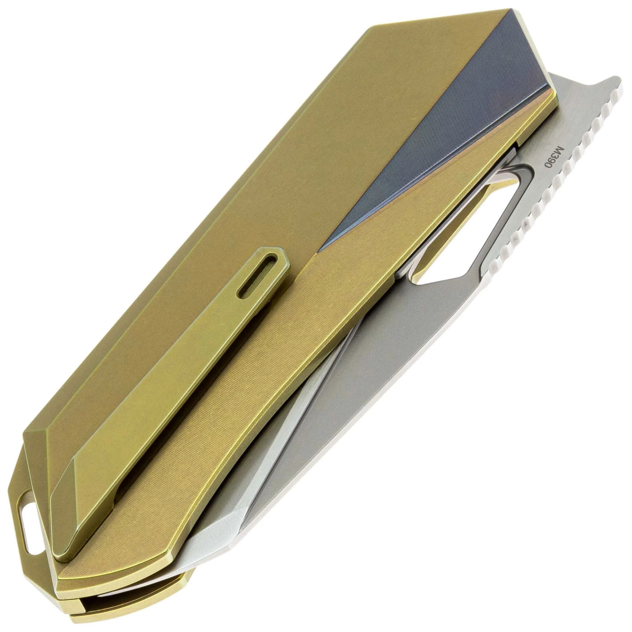 Рукоять выполнена из титана в золотом исполнении. Материал обеспечивает прочность конструкции при сохранении комфортного веса. Эргономичная форма способствует уверенному хвату, а текстурированные участки улучшают сцепление с ладонью. Установлена титановая клипса формата tip-up для удобного ношения в кармане, также предусмотрено отверстие под темляк.