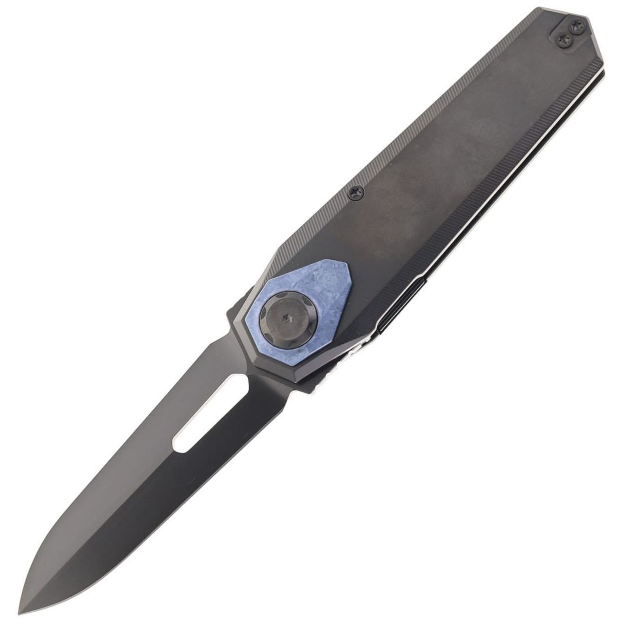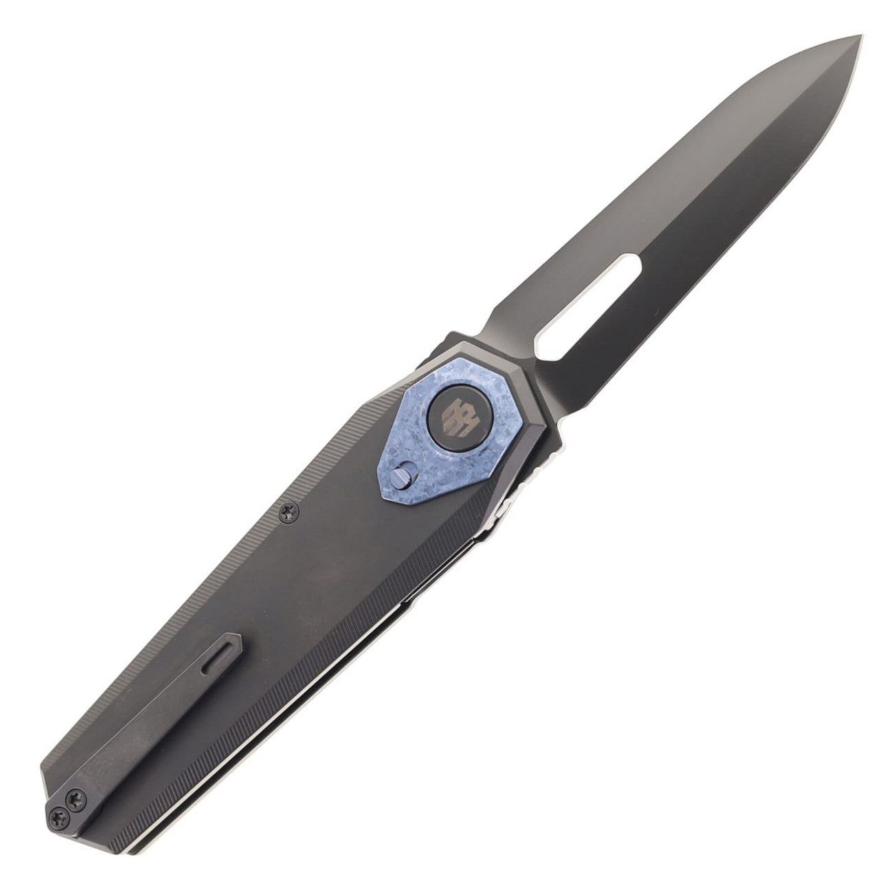Рукоять выполнена из титана с износостойким DLC-покрытием чёрного цвета. Материал отличается высокой прочностью, устойчивостью к коррозии и механическим повреждениям. Форма рукояти продумана для уверенного хвата и стабильности при нагрузках. Чёрная обработка подчёркивает тактический характер модели и защищает поверхность от износа при ежедневном ношении.