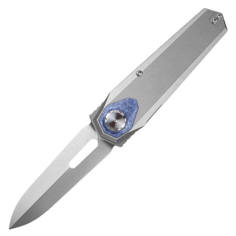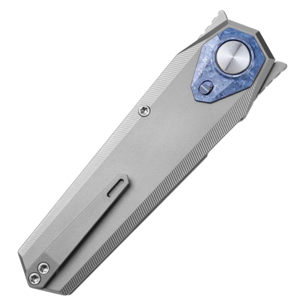 Рукоять выполнена из титана с износостойким DLC-покрытием чёрного цвета. Материал отличается высокой прочностью, устойчивостью к коррозии и механическим повреждениям. Форма рукояти продумана для уверенного хвата и стабильности при нагрузках. Чёрная обработка подчёркивает тактический характер модели и защищает поверхность от износа при ежедневном ношении.