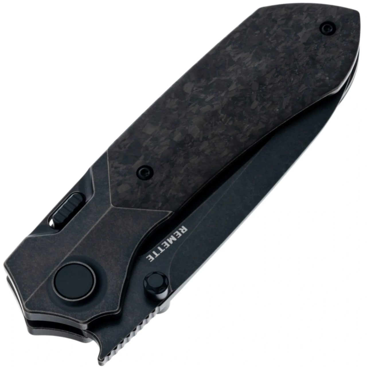 Remette Meteor Black (RTPT-ELD) — мощный и технологичный складной нож, сочетающий премиальные материалы и продуманную механику. Модель выполнена в строгом чёрном исполнении с титановым основанием и карбоновыми накладками. Несмотря на выразительный дизайн и статусный внешний вид, нож полностью ориентирован на ежедневное ношение и практическое использование.
