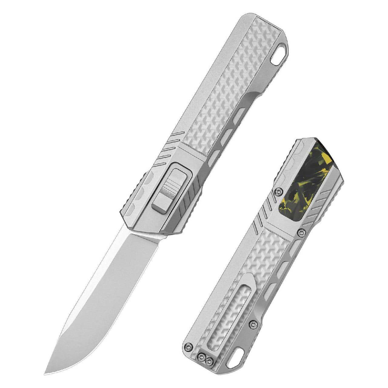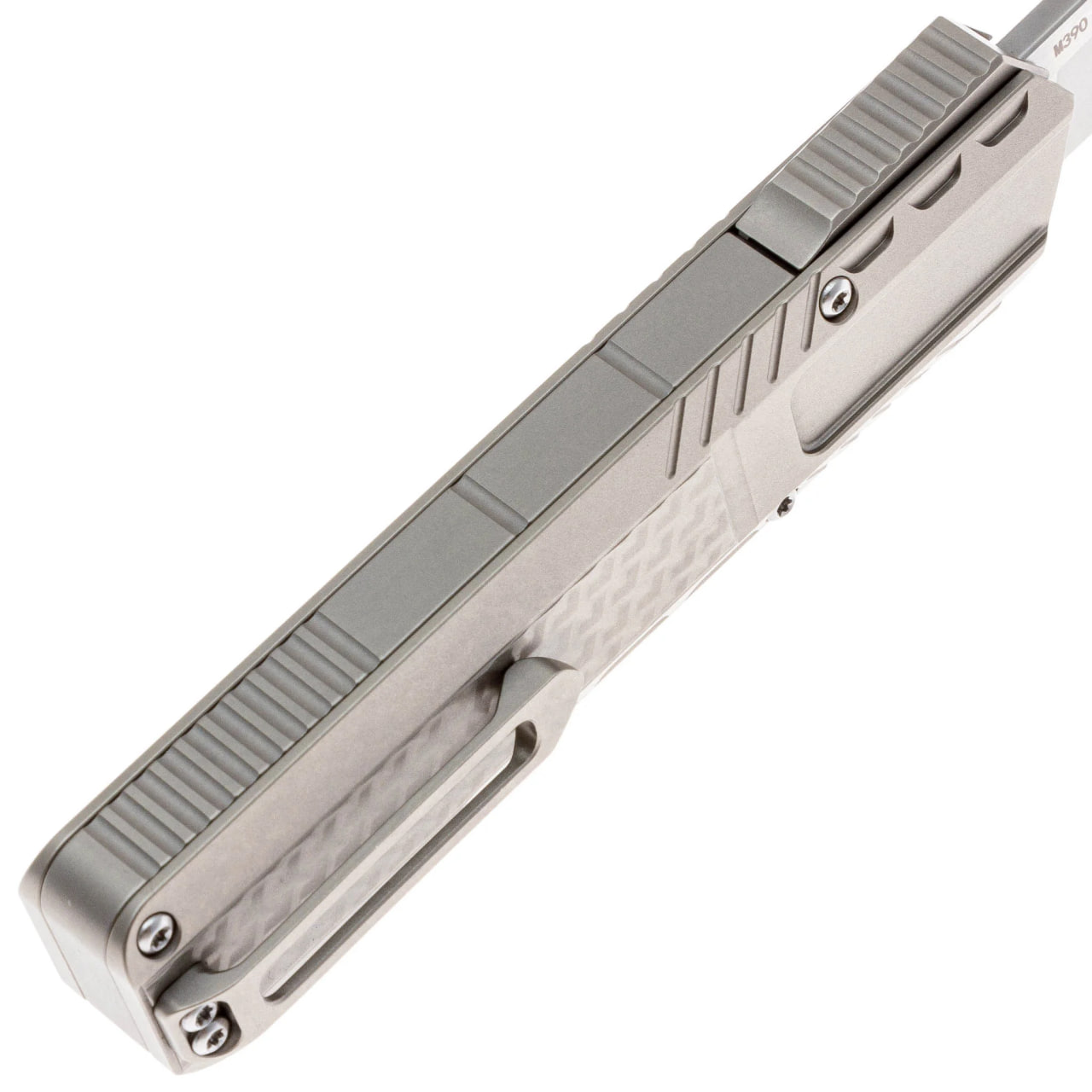 Рукоять выполнена из титана с карбоновыми элементами, что обеспечивает сочетание прочности и умеренного веса. Материал устойчив к коррозии и механическим нагрузкам, а эргономичная форма с текстурированными элементами способствует уверенному хвату. Конструкция дополнена карманной клипсой для удобного ношения и отверстием под темляк.