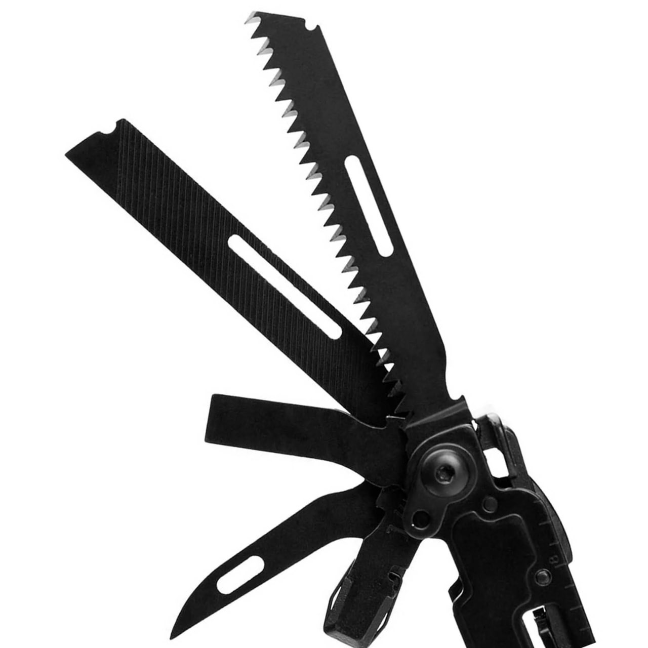 Корпус выполнен из стали и имеет чёрное защитное покрытие, повышающее устойчивость к износу и коррозии. Мультитул уверенно лежит в руке, не люфтит и ощущается как монолитный инструмент. Продуманная эргономика позволяет быстро доставать нужный инструмент даже в перчатках или в условиях ограниченного пространства.