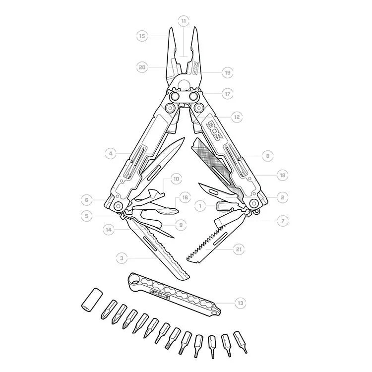 Одной из ключевых особенностей версии Deluxe является расширенный набор бит. В комплект входит 13 насадок, включая Phillips, плоские, Torx и Hex, что превращает мультитул в полноценный компактный набор отвёрток для ремонта и обслуживания техники.