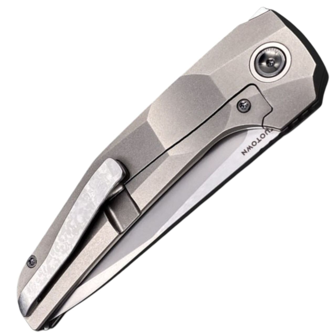 Рукоять из титана TC4 здесь играет двойную роль: основа конструкции/замка и рабочая хватовая зона. Титан не только уменьшает общий вес — он даёт высокий предел прочности при защите от деформаций. При нажатиях на фрейм нет “просадки”, характерной для более мягких сплавов. Таким образом, фиксация клинка остаётся стабильной после сотен открытий. DLC-слой на титане снижает износ, уменьшает скольжение и практически исключает появление точечных пятен от пота или влаги. Клипса выполнена в общем стиле и обеспечивает удержание без расшатывания; плавность захода на карман — высокая. Темлячное отверстие интегрировано так, что не мешает хвату и не меняет баланс.