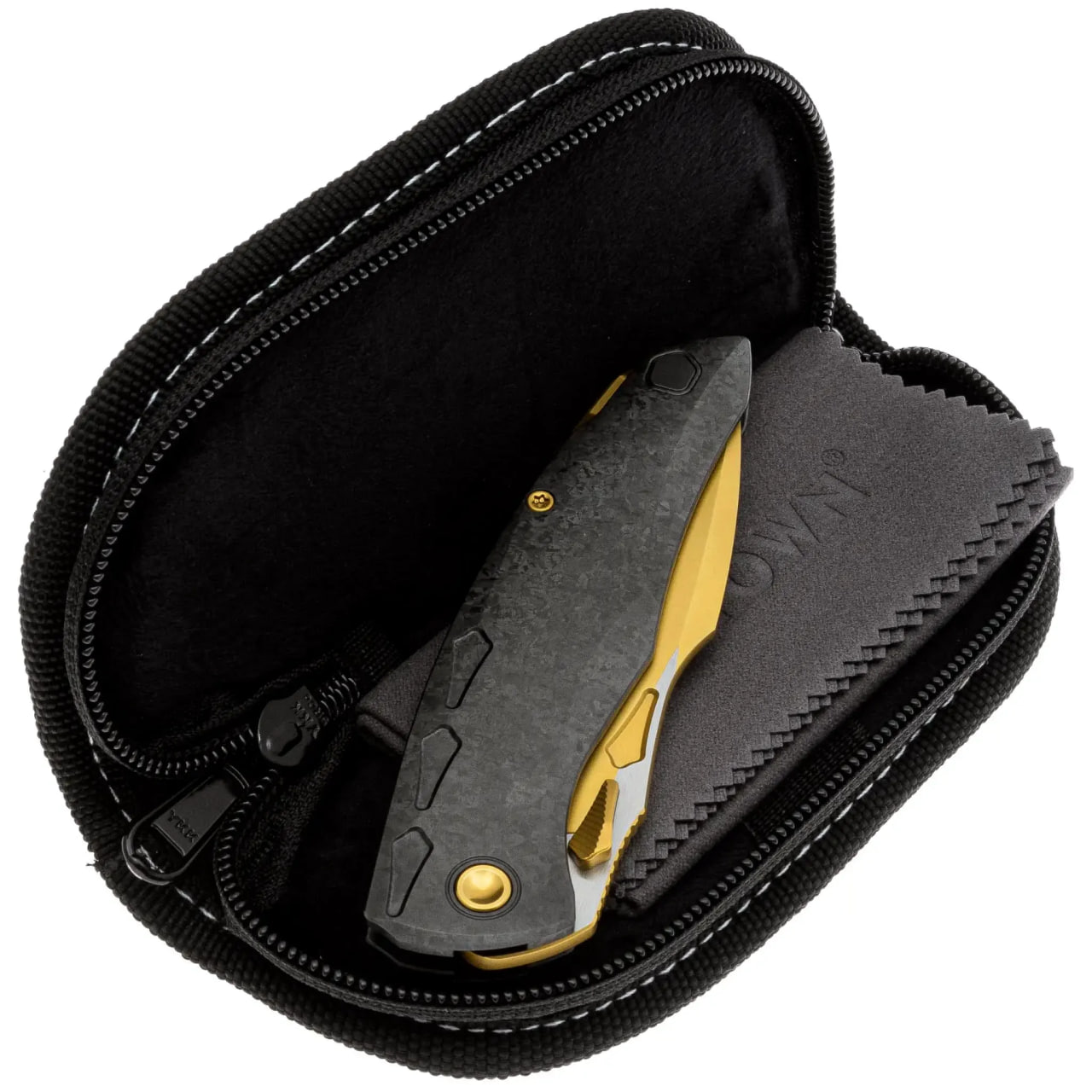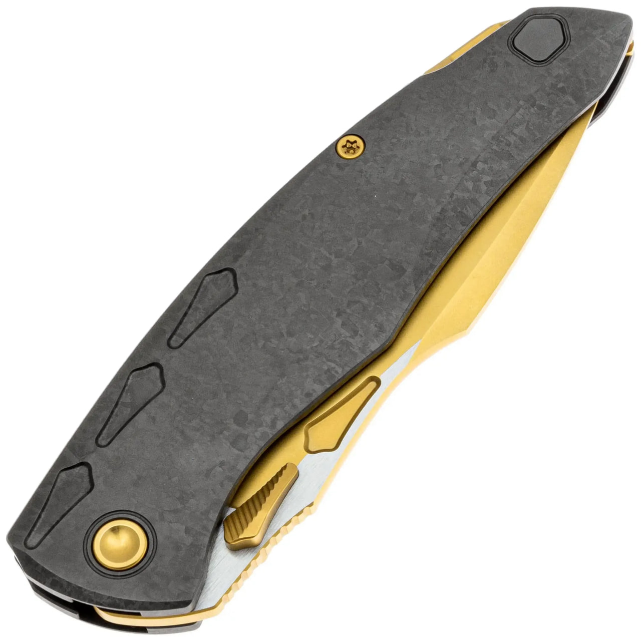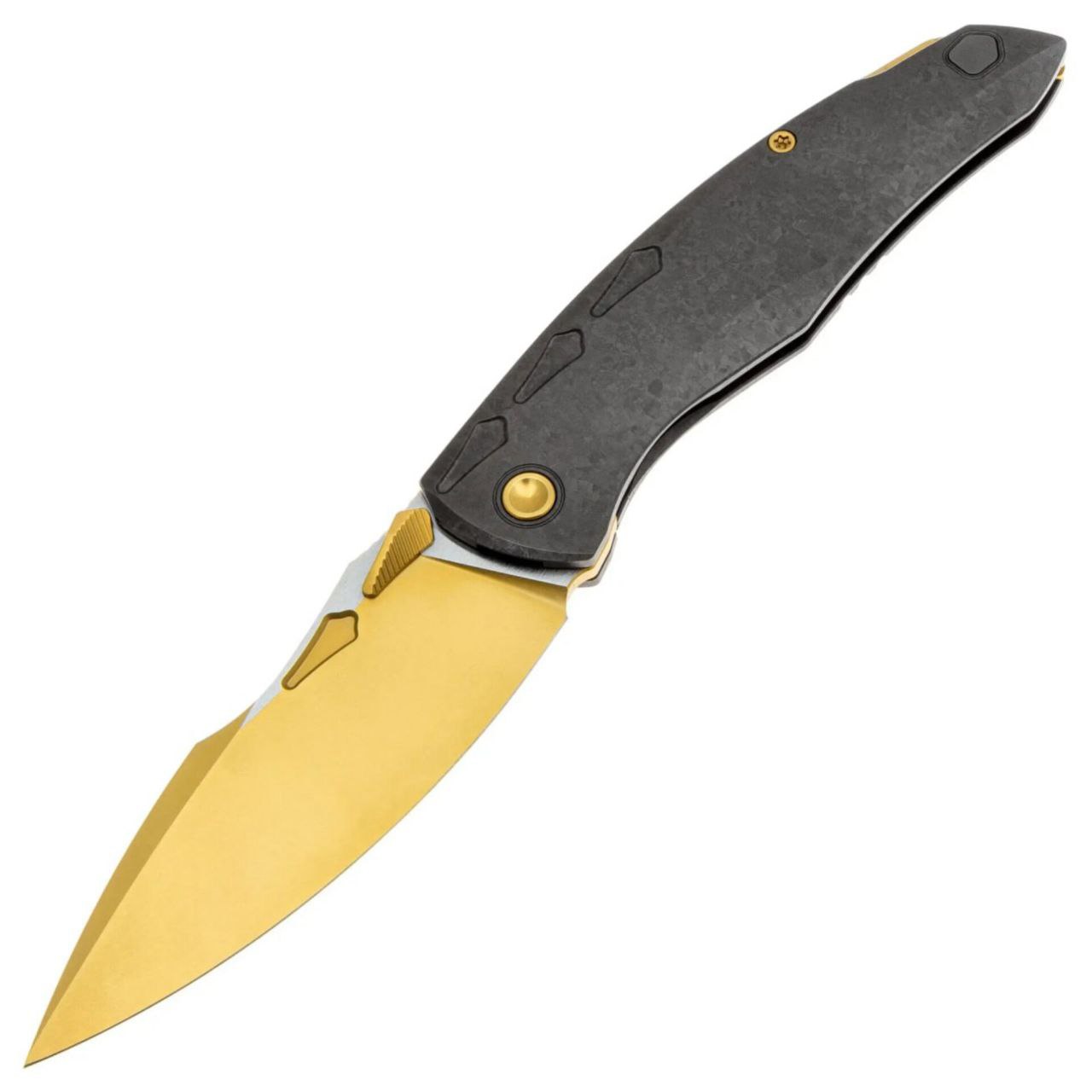 Клинок изготовлен из стали T14N — это Sandvik 14C28N, прошедшая фирменную термообработку Tuotown, что повышает её твёрдость и устойчивость к выкрашиванию. Покрытие PVD золотого цвета не только подчеркивает внешний вид ножа, но и улучшает коррозионную стойкость. Геометрия drop-point делает Krotos универсальным для реза и точных работ. Открытие происходит при помощи массивного шпенёк-флиппера, а осевой узел на керамических подшипниках обеспечивает плавную механику. Надёжный frame-lock удерживает клинок без малейших люфтов.
