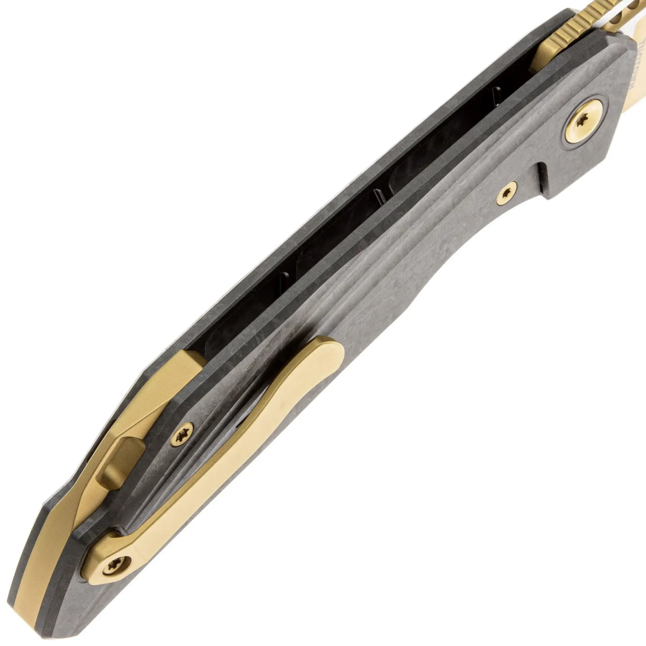 Рукоять выполнена из титана с аккуратной анатомической геометрией, обеспечивающей естественный и контролируемый хват. Кристаллизованная структура металла придаёт поверхности характерный визуальный эффект, а обработка Bead-Blast делает её приятной на ощупь. Конструкция обладает стабильностью и лёгкостью, клипса рассчитана на удобное ежедневное ношение, а отверстие под темляк расширяет возможные способы фиксации и персонализации ножа.