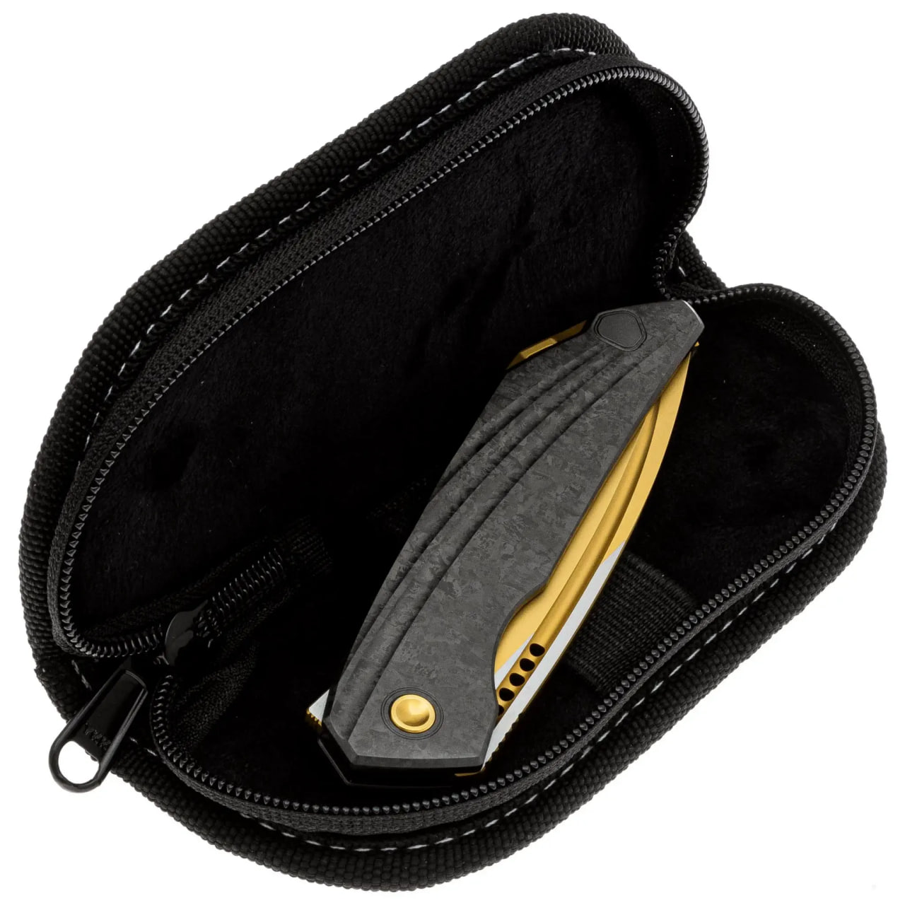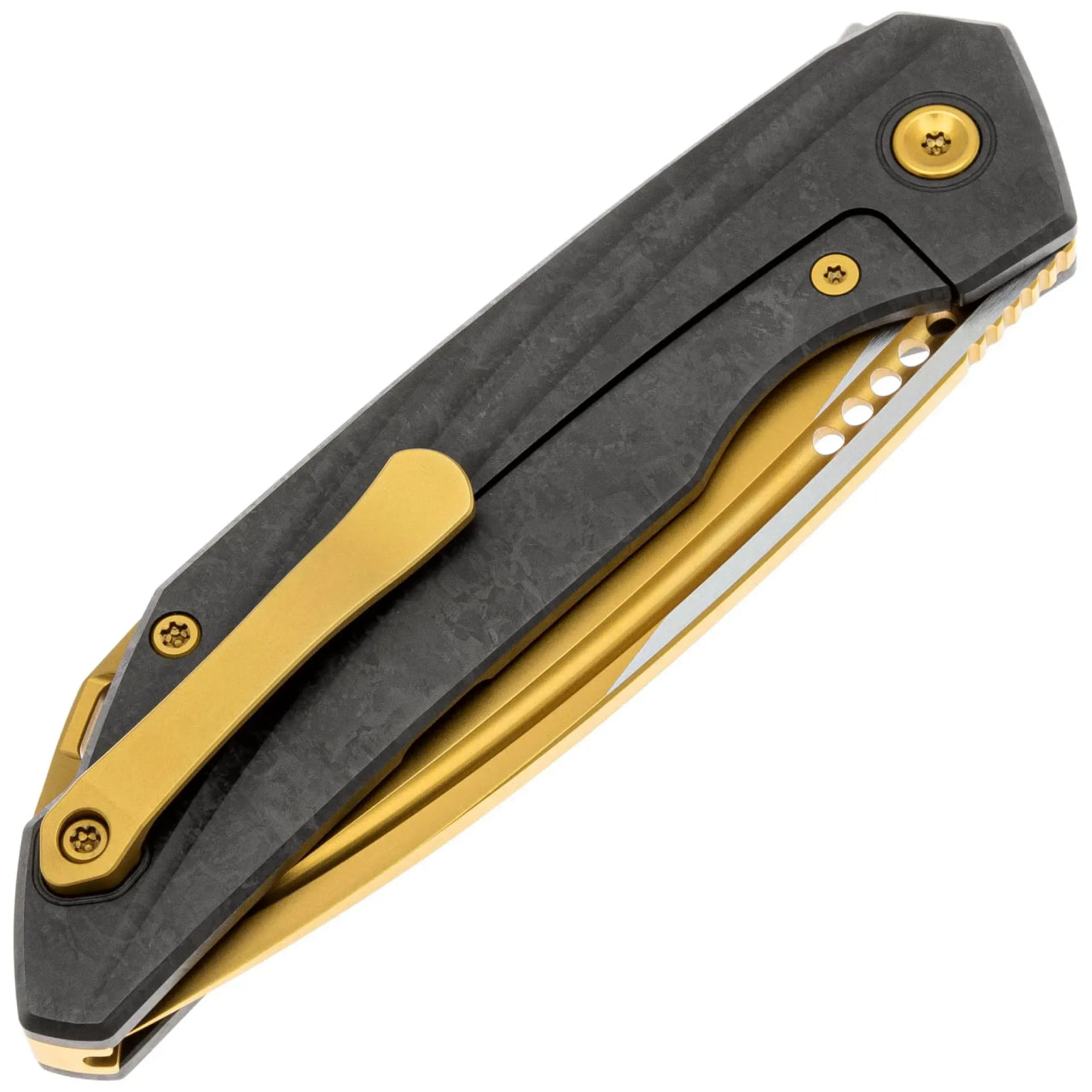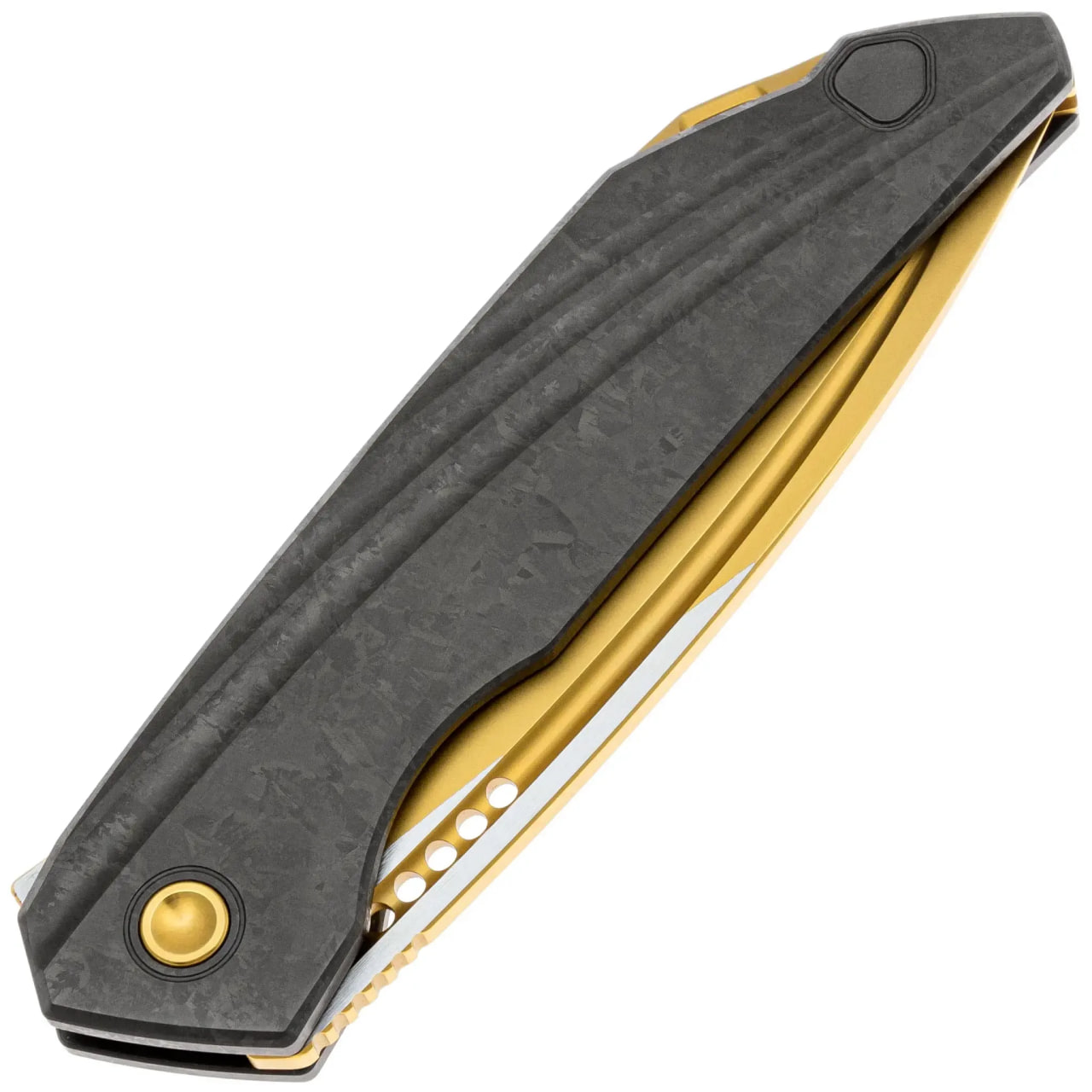 Клинок изготовлен из T14N — улучшенной версии Sandvik 14C28N с фирменной термообработкой TuoTown, которая обеспечивает твёрдость около 62 HRC и хорошую стойкость режущей кромки. Геометрия drop-point с грамотной линией снизу делает нож точным и предсказуемым в работе, а золотое PVD-покрытие защищает поверхность от коррозии и царапин и добавляет модели визуальный акцент. Клинок открывается через флиппер или дол, а механика на подшипниках обеспечивает плавный ход и моментальный выход клинка при необходимости. Надёжная фиксация достигается за счёт прочного frame-lock.